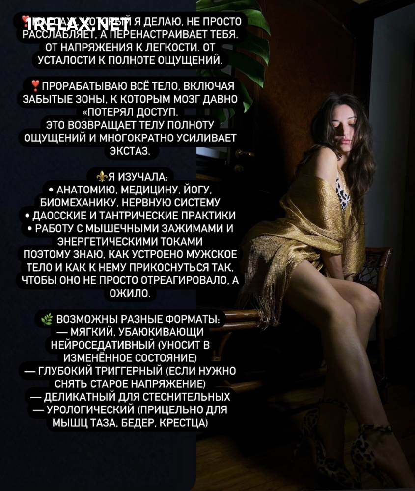 Мастер заведения прошел профессиональное обучение и может не только подарить незабываемые сексуальные эмоции, но и качественно проработает все мышцы тела.